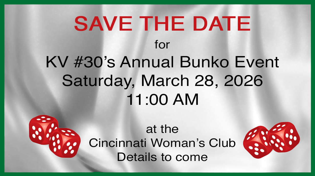 Join KV #50 for a wonderful luncheon at the Cincinnati Woman’s Club to be followed by some fun playing Bunco.